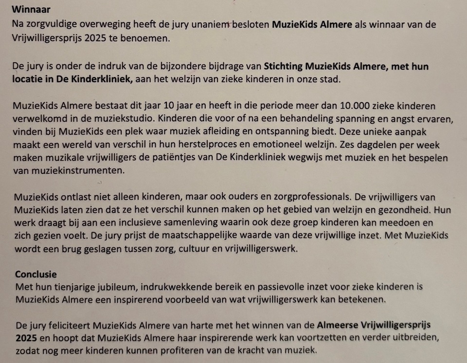 Een indrukwekkende erkenning van ons muzikale jeugdzorgproject en tevens grote waardering voor onze Studio-arbeid, het begeleiden van de jeugdige patiëntjes tot 18 jaar bij het ontdekken en laten beleven van de rijkdom “MUZIEK” middels het verzorgen van een helende, muzikale pleister.